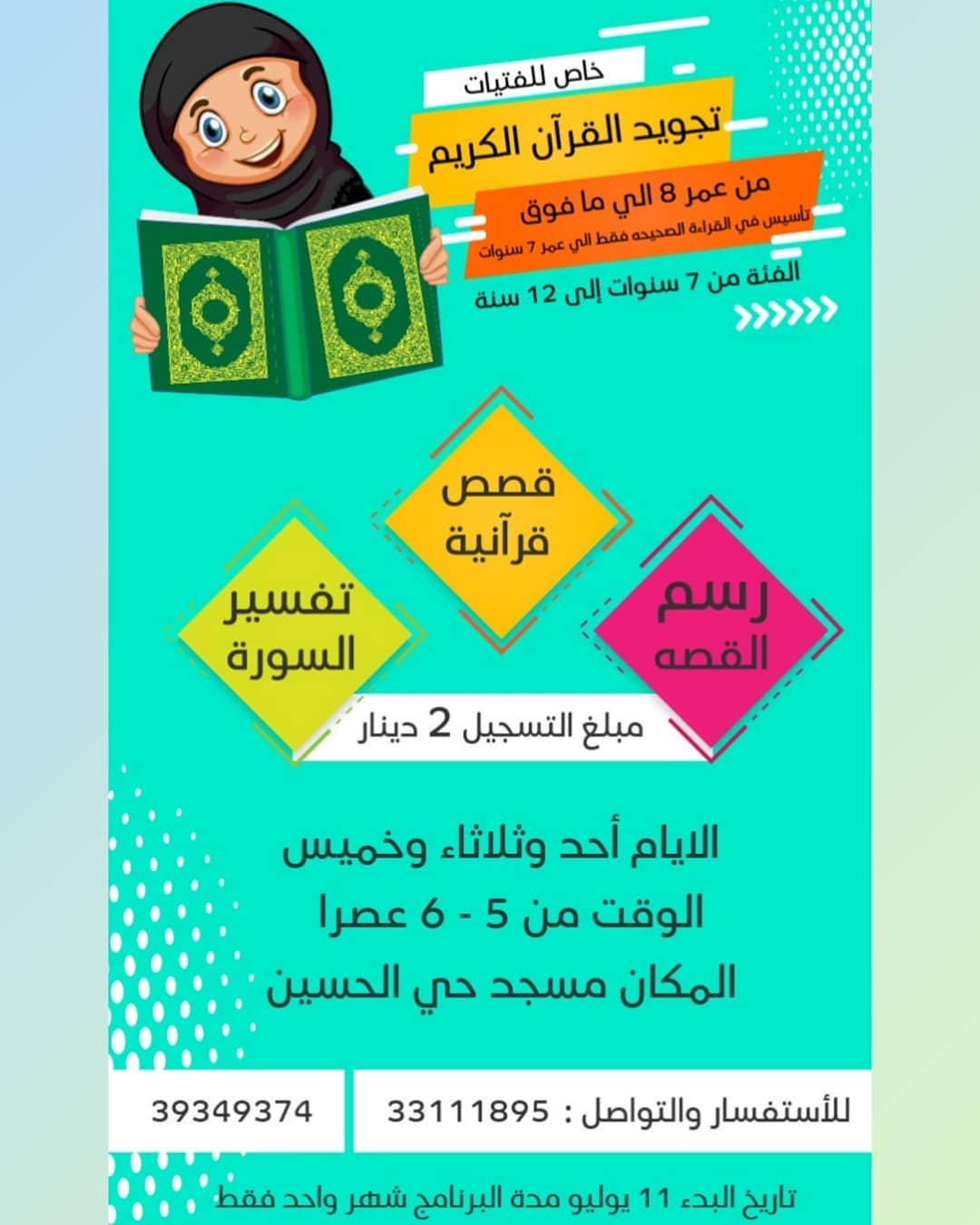 إعلان خيري: برنامج تعليم تجويد القرآن الكريم للفتيات بحي الحسين عليه السلام …