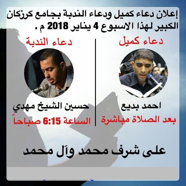 . إعلان دعاء كميل ودعاء الندبة بجامع كرزكان الكبير لهذا الإسبوع 4 يناير 2018 م #karzakancom #karzakkan #karzakan #bahrain #كرزكان #دعاء_كميل_كرزكان #دعاء_كميل #دعاء_الندبة المصدر