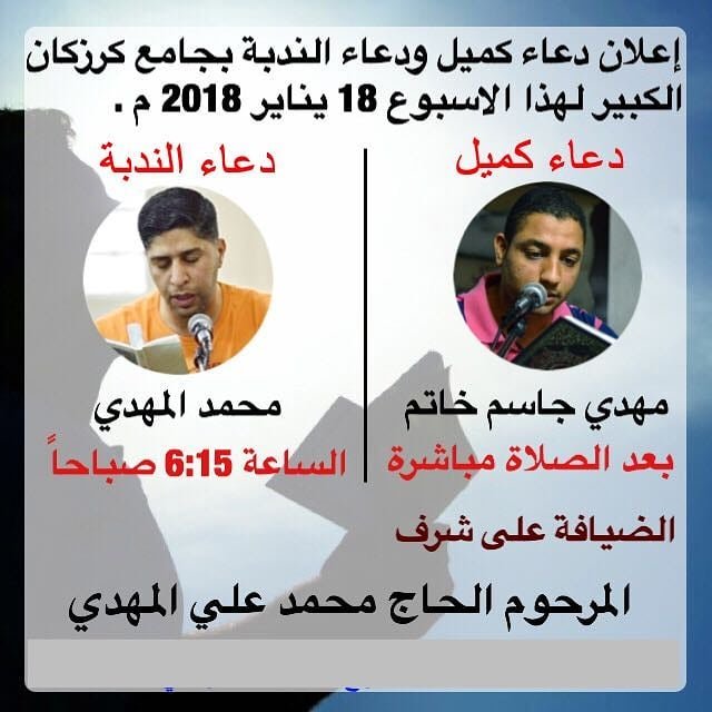 . إعلان دعاء كميل ودعاء الندبة بجامع كرزكان الكبير لهذا الإسبوع 18 يناير 2018 م #karzakancom #karzakkan #karzakan #bahrain #كرزكان #دعاء_كميل_كرزكان #دعاء_كميل #دعاء_الندبة المصدر