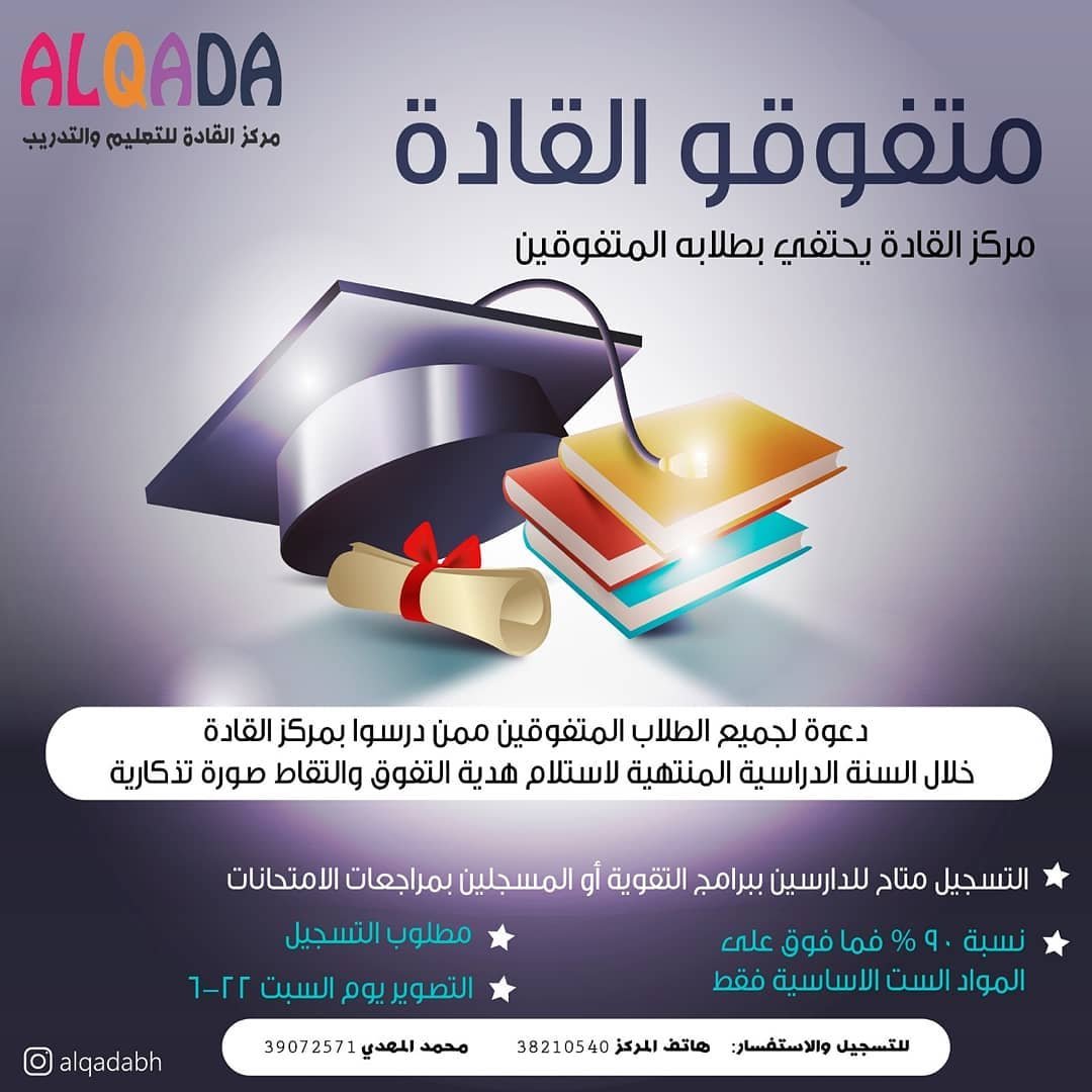 مركز القادة يدعو جميع الطلاب الذين درسوا لديه في الدورات المنتظمة أو في مراجعات الامتحانات سواء في الفصل الاول او الثاني… للحضور لاستلام هدية التفوق والتقاط صورة تذكارية بذلك