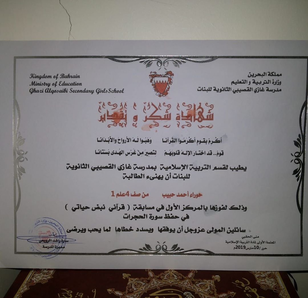 بمناً من الله سبحانه وتعالى نهنئ الطالبة الحبوبة حوراء بمناسبة فوزها بالمركز الاول في مسابقة قرآني نبع حياتي وجعلها الله من المداومين والمحبين لقراءة القرآن والسائرين على نهج القرأن سائلين المولى العظيم ان يسدد خطاها ويجعل القرآن ربيع قلبها