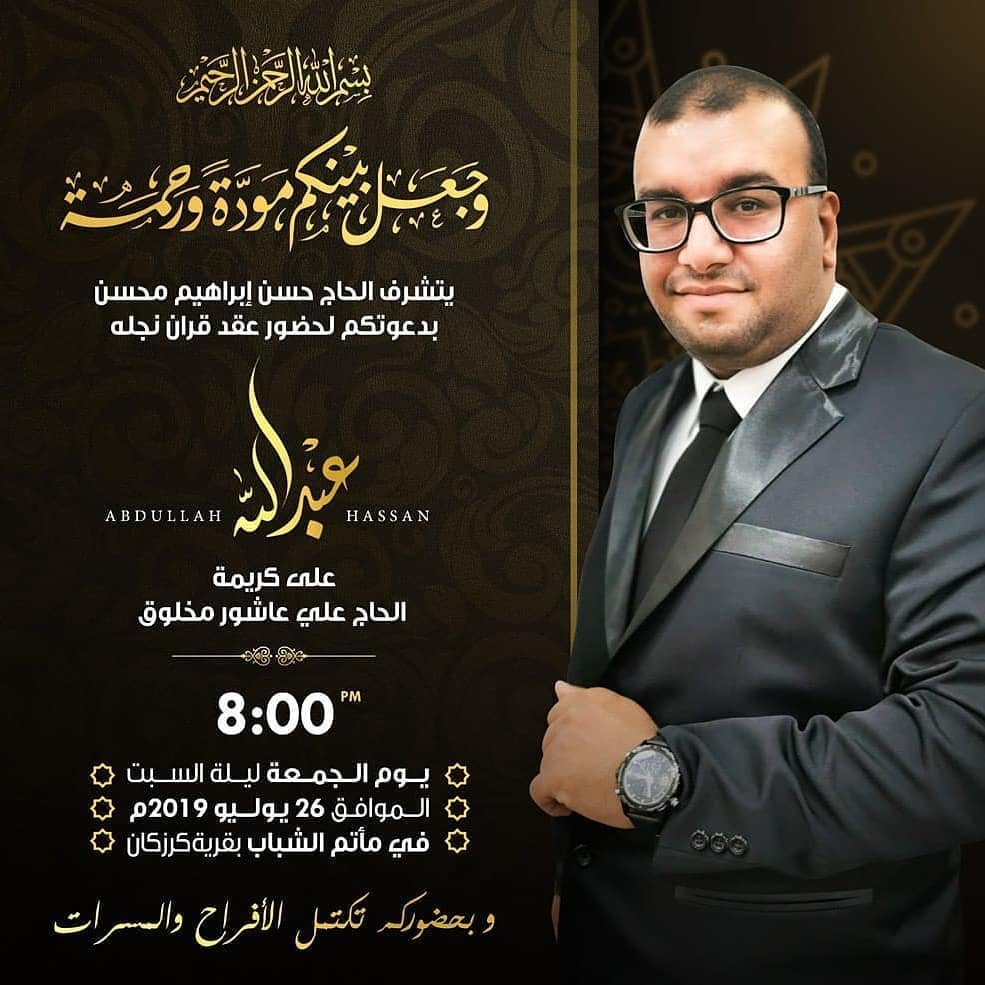 الليلة: يتشرف الحاج حسن إبراهيم محسن بدعوتكم لحضور عقد قران نجله عبدالله