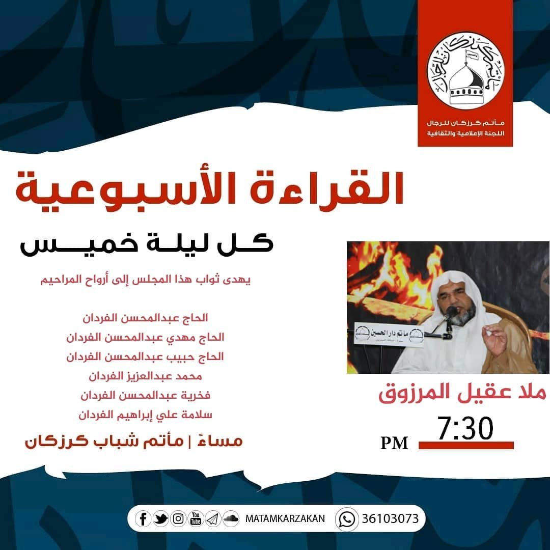 برنامج القرآءة الأسبوعية بمأتم كرزكان للرجال مساء غدا