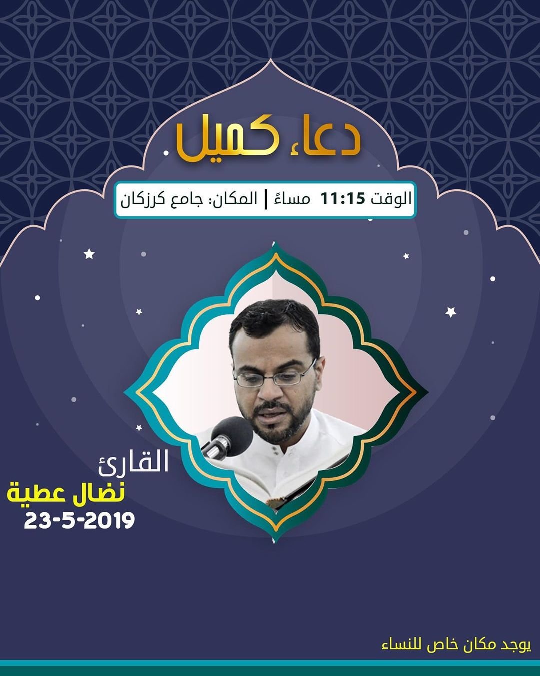 برنامج قراءة دعاء كميل ليلة الجمعة يبدأ في تمام الساعة 11:15 مساء بمشاركة القارئ نضال عطية في جامع كرزكان