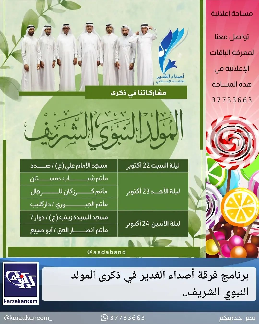 برنامج مشاركات فرقة أصداء الغدير في ذكرى ولادة الرسول الأكرم محمد (ص) وحفيده الإمام الصادق (ع)