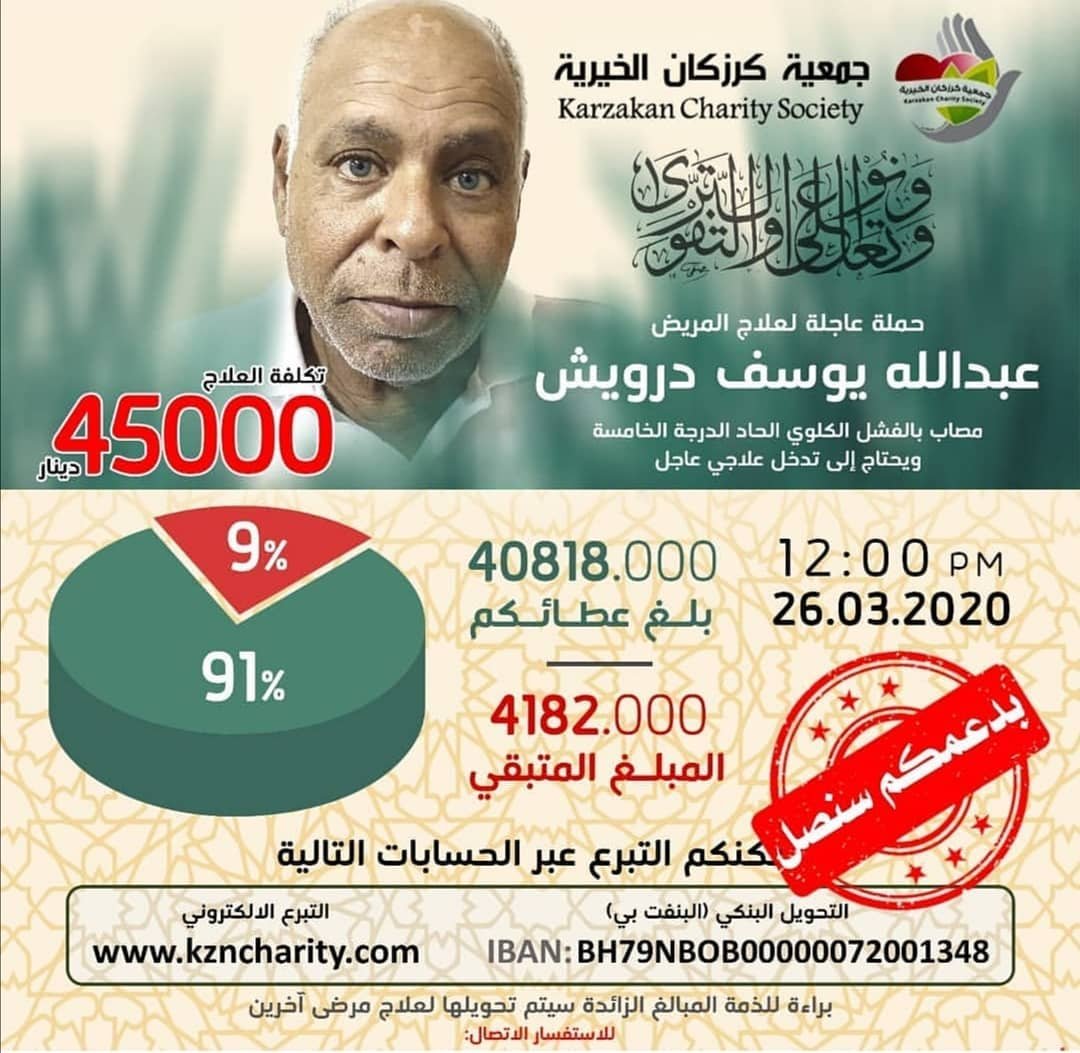 💌 الحملة الإنسانية العاجلة: *وتعاونوا على البر والتقوى* 〰〰〰〰〰 ✒ *لإنقاذ المريض: “عبدالله يوسف درويش”* المصاب بفشل كلوي حاد من الدرجة الخامسة ويحتاج إلى تدخل علاجي عاجل. 💴 *تكلفة العلاج :*