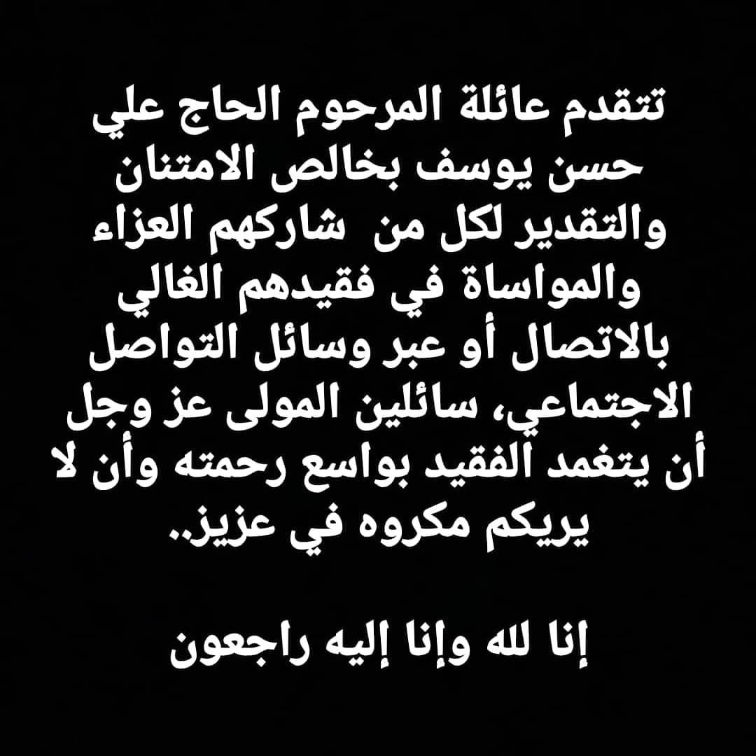 تتقدم عائلة المرحوم الحاج علي حسن يوسف بخالص الامتنان والتقدير لكل من شاركهم العزاء والمواساة في فقيدهم الغالي بالاتصال أو عبر وسائل التواصل الاجتماعي، سائلين المولى عز وجل أن يتغمد الفقيد بواسع رحمته وأن لا يريكم مكروه في عزيز..