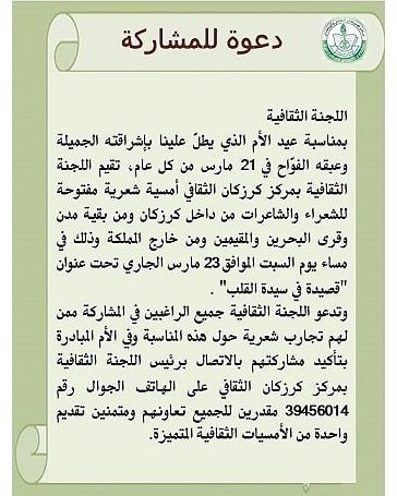 تدعوكم اللجنة الثقافية بالمركز للمشاركة بالأمسية الشعرية المفتوحة، وذلك بمناسبة يوم الأم. وستكون الأمسية مساء يوم السبت ٢٣ مارس.