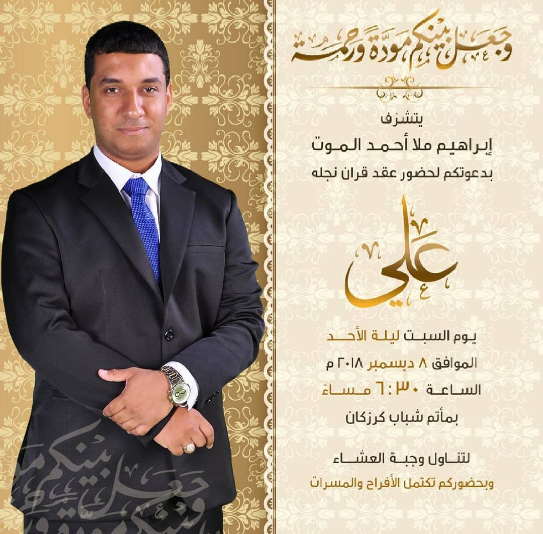 تذكير: يتشرف إبراهيم ملا أحمد الموت بدعوتكم لحضور حفل عقد قران نجله علي هذه الليلة