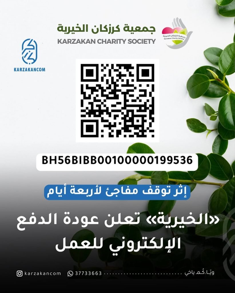 أعلنت جمعية كرزكان الخيرية عن عودة الحساب البنكي وخدمة الدفع الإلكتروني للعمل مجددًا، وذلك بعد توقفٍ مفاجئ استمر لمدة أربعة أيام لأسباب خارجة عن الإرادة.