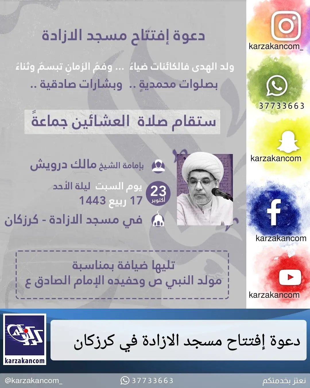 دعوة إفتتاح مسجد الازادة الذي يقع في حي ساحل كرزكان حيث ستقام فيه صلاة العشائين جماعة بإمامة الشيخ مالك درويش..