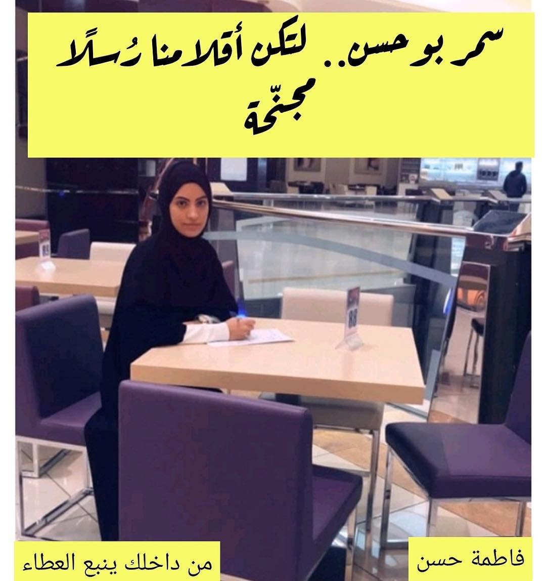 سمر بوحسن.. طالبة الإسلاميات بجامعة البحرين والتي انضمت للكتابة الالكترونية بمشاركتها في كتابة المقالات بحسابها الشخصي، وبعض الحسابات الأخرى. .