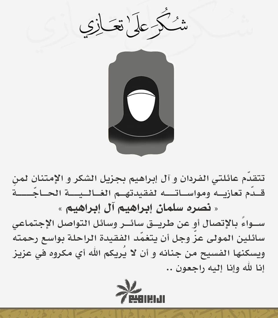 شكر على تعازٍ المرحومة نصرة سلمان إبراهيم المصدر