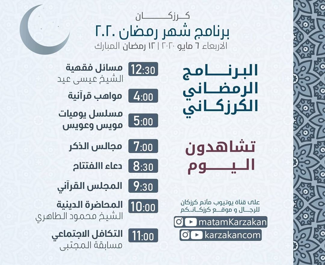 🔴 ضمن باقة البرنامج الرمضاني الكرزكاني.. . *تشاهدون اليوم* . 📍الأربعاء ٦ مايو الموافق ١٢ رمضان المبارك . 📺 باقة متنوعة من البرامج الدينية والثقافية والاجتماعية . . 🤝🏻 كونوا بالقرب منا ونسألكم الدعاء.. المصدر