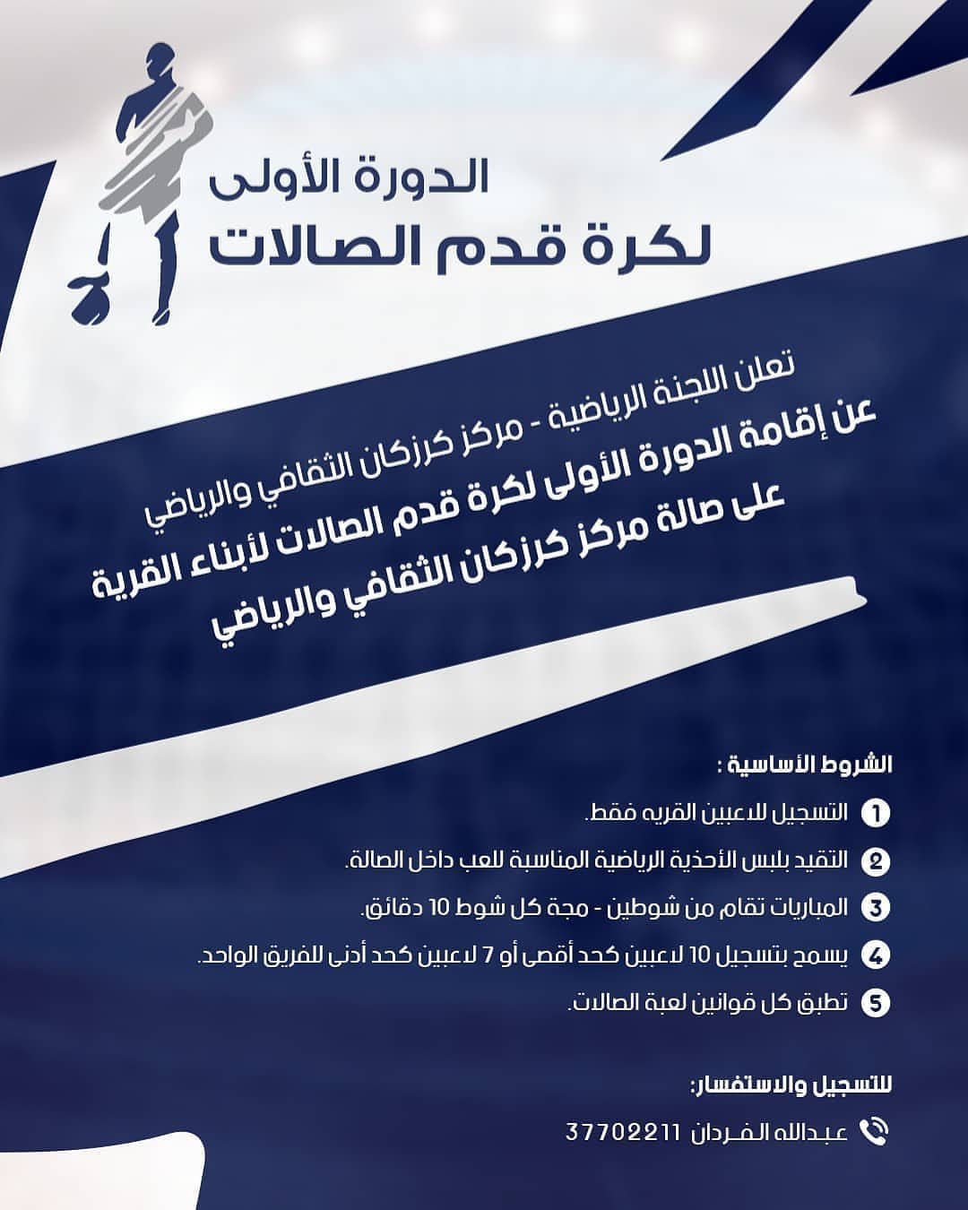 فتح باب التسجيل للدورة الأولى لكرة قدم الصالات. للشروط والتسجيل الاعلان. #مركز_كرزكان #مركز_كرزكان_الثقافي_والرياضي #رمضان_مركز_كرزكان المصدر
