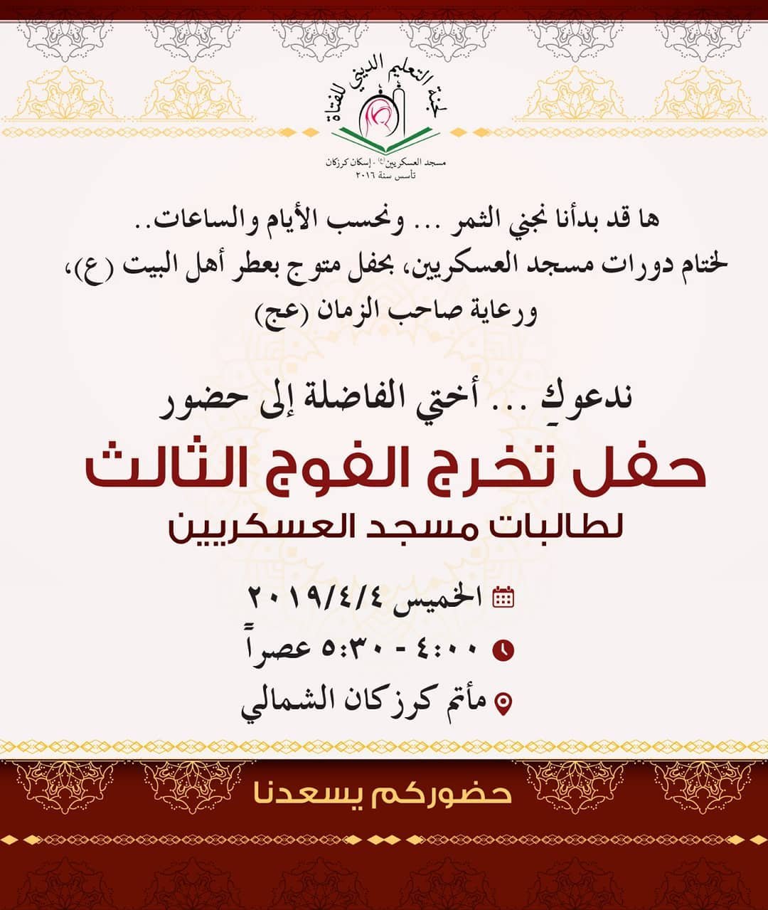 لجنة التعليم الديني للفتاة بمسجد العسكريين تنظم حفل تخريج الفوج الثالث لطالباتها المكلفات المصدر
