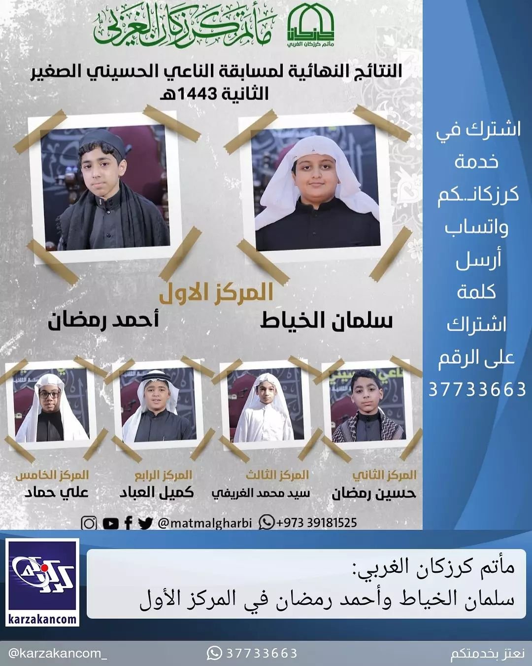 مأتم كرزكان الغربي يعلن نتائج مسابقة الناعي الحسيني الصغير الثانية ١٤٤٣هـ