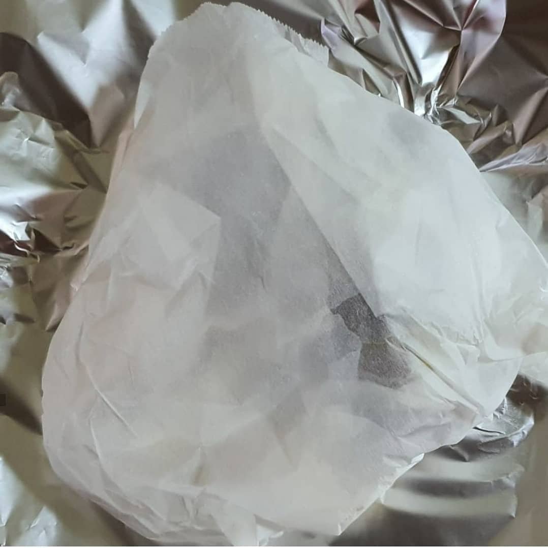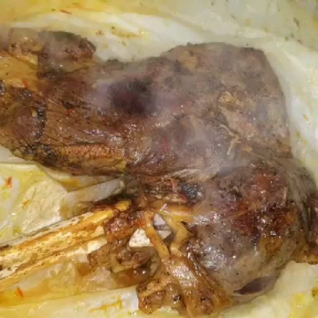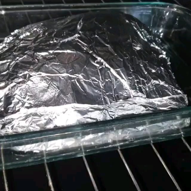 بعد الساعة اطلع اللحمة من قدر ضغط وخلي عليه ماء الورد والزعفران والزيت المنقوع بالفرشاة من الجهتين واغلفه بورق زبدة ثم القصدير بأحكام (أكتمه) واخليه بقالب فيه ماء وادخله الفرن يكمل استواه ع البخار ..