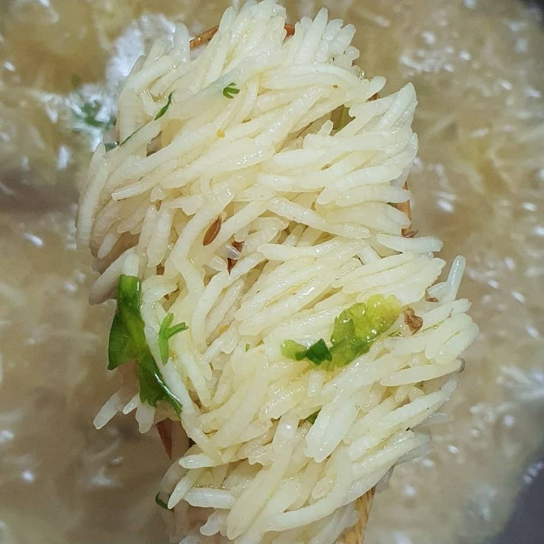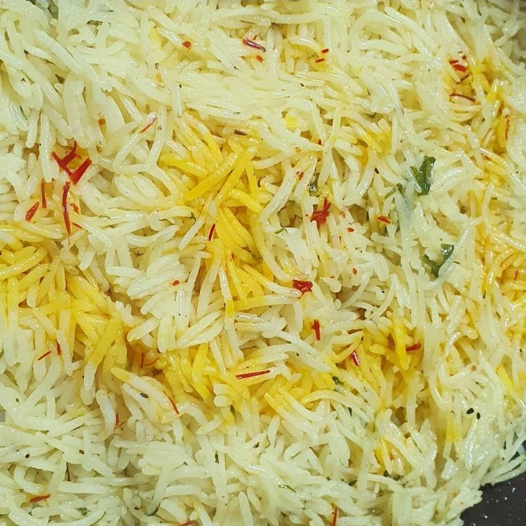 العيش // اطبخه في ماء سلق اللحم المتبقى مع اضافة توابل يا تصفينه يا تكبسينه براحتكم .. اني اصفيه وانشفه واخلي عليه الزعفران وماء الورد وانشفه .. تقدرين تخلين رائحة الشواء