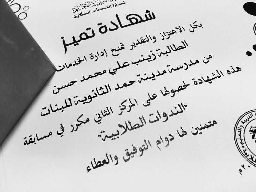 نبارك لأبنة القرية زينب علي محمد المهدي لحصولها على المركز الثاني على مستوى مدارس البحرين الثانوية في مسابقة الندوات الطلابية