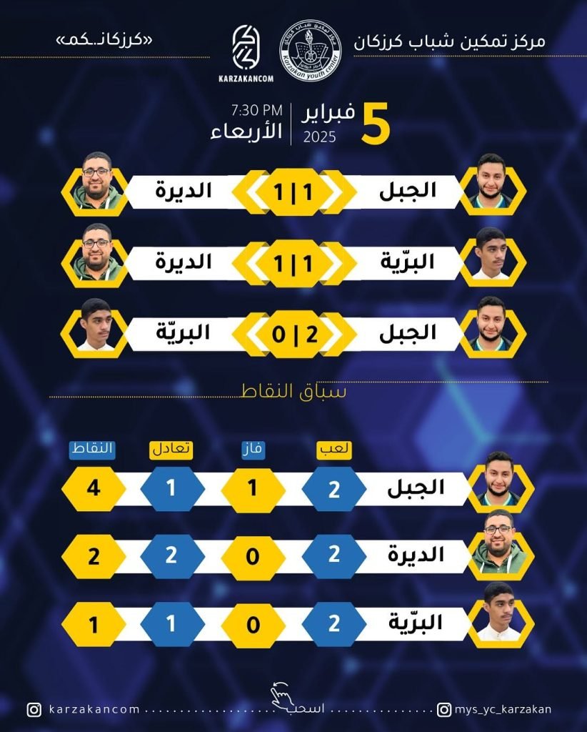 نتائج اليوم الأول من منافسات مسابقة حروف الثقافة التي ينظمها مركز تمكين شباب كرزكان و«كرزكانـ.ـكمـ»، والتي انطلقت بصالة المركز مساء أمس الأربعاء 5 فبراير وانتهت بتصدر فريق الجبل بتحقيق 4 نقاط من فوز و