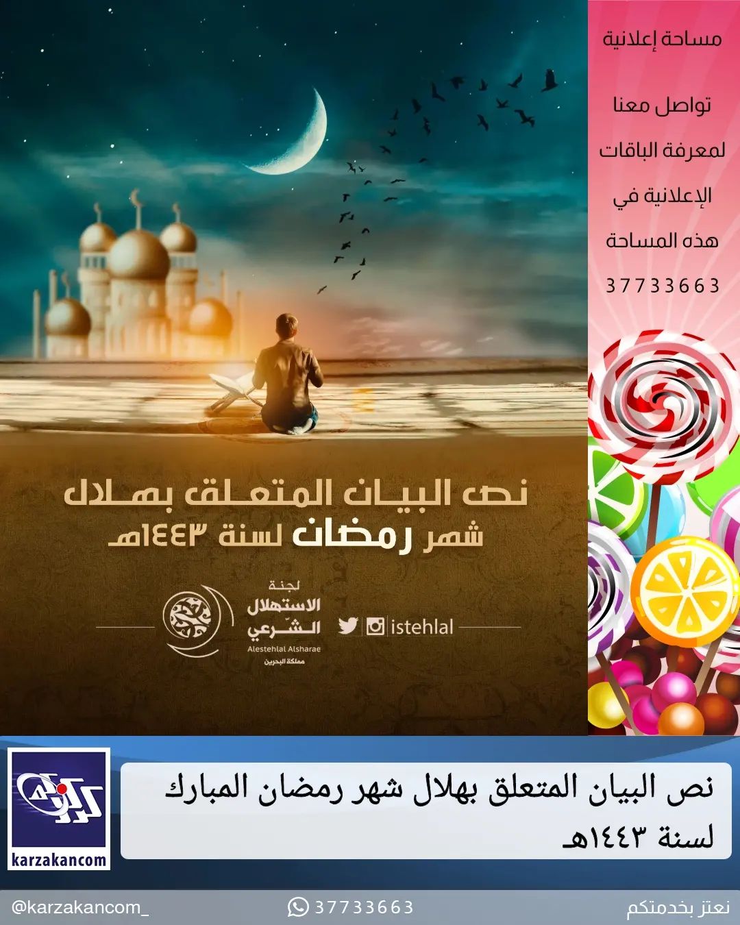 نظرا لتحقق الشياع برؤية الهلال في عدة مناطق من البحرين، وذلك مساء هذا اليوم السبت (ليلة الأحد)، فقد تم اعتماد يوم غد الأحد غرة شهر رمضان المبارك لسنة 1443 للهجرة.