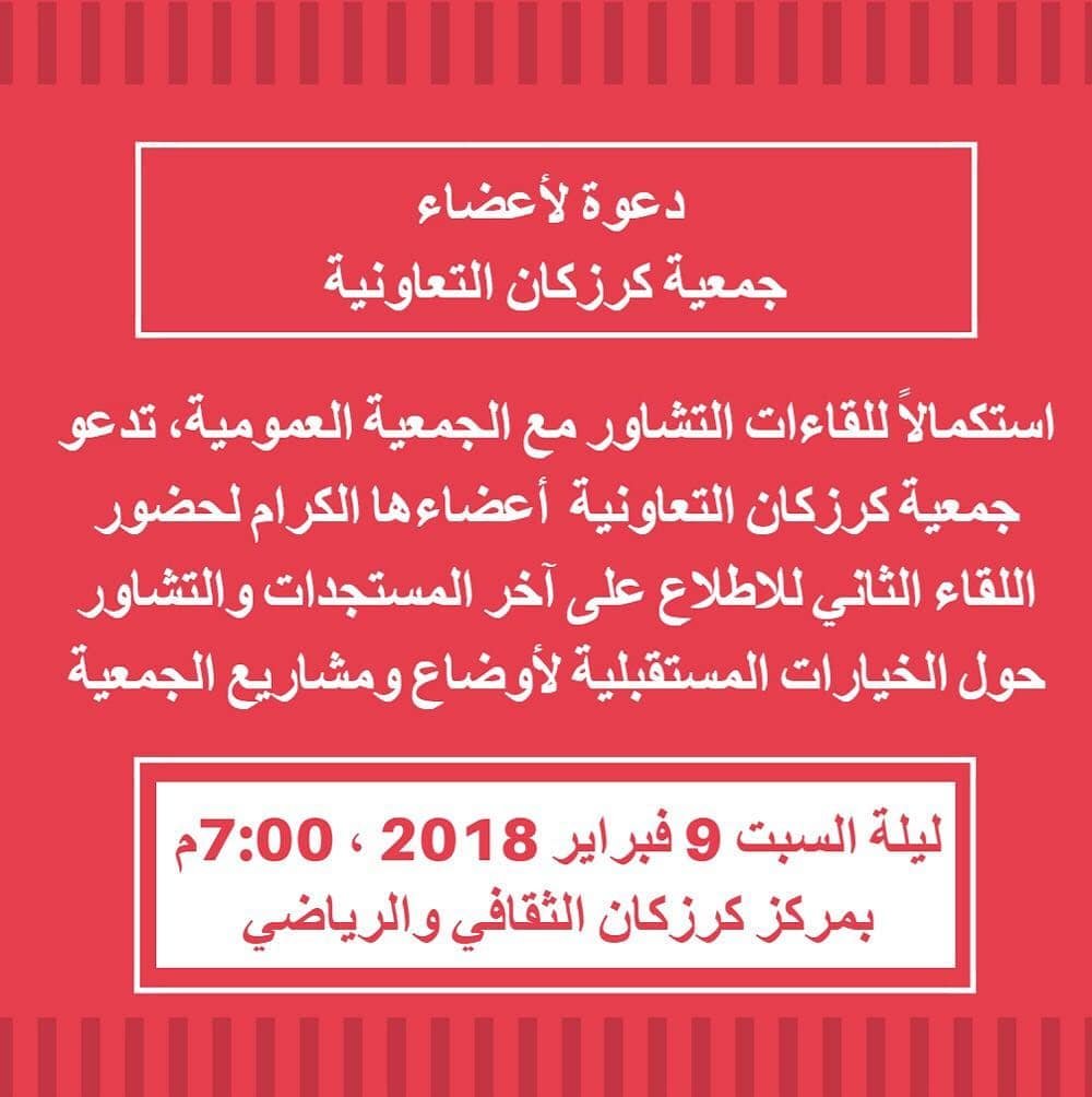 تدعو إدارة جمعية كرزكان التعاونية أعضاءها الكرام لاجتماع تشاوري ثانٍ مع الجمعية العمومية ليلة السبت القادمة 9 فبراير 2018 بالصالة الرياضية لمركز كرزكان الثقافي والرياضي للاطلاع على آخر المستجدات والتشاور حول الخيارات المستقبلية لأوضاع ومشاريع الجمعية.
