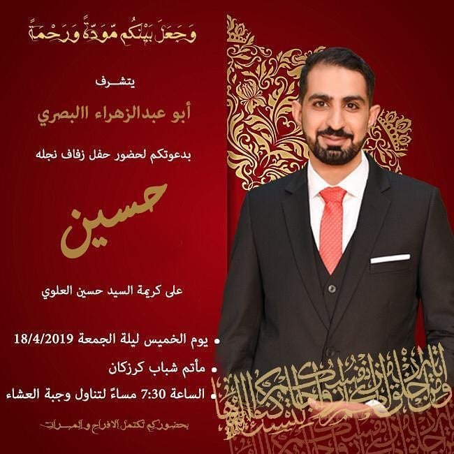 يدعوكم أبو عبدالزهراء البصري لحضور حفل زفاف نجله حسين