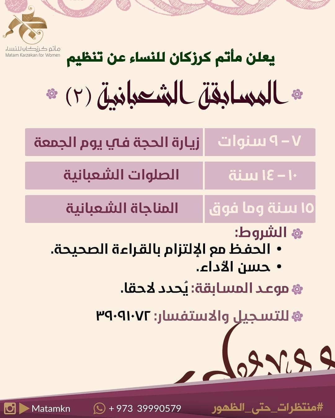 يعلن مأتم كرزكان للنساء عن فتح باب الاشتراك في المسابقة الشعبانية الثانية المصدر