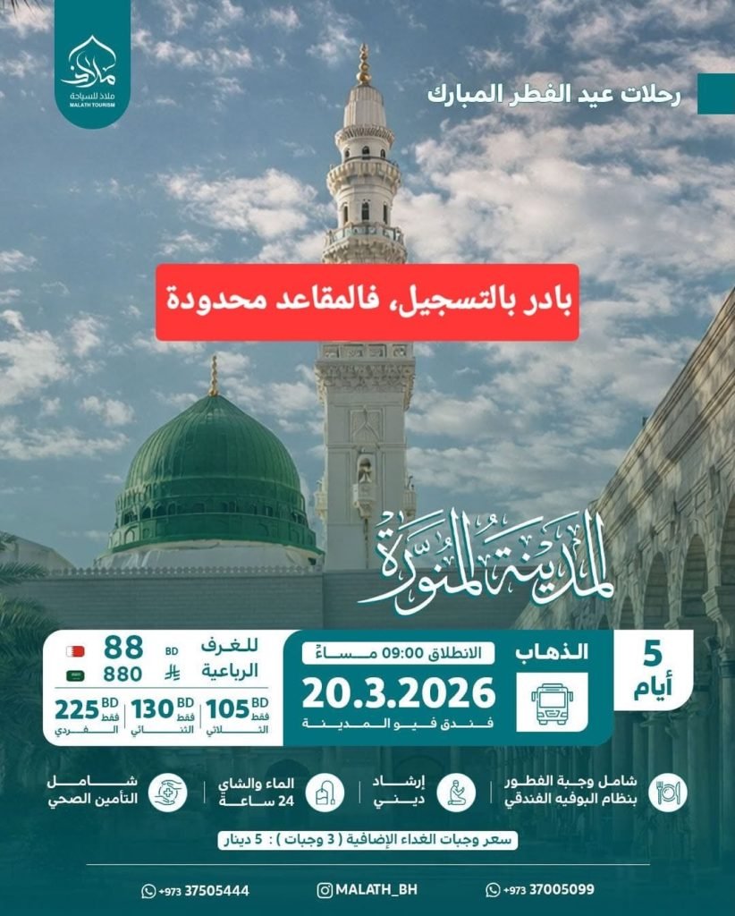 المدينة المنورة _ إجازة عيد الفطر المبارك بادر بالتسجيل .. 💫 فالمقاعد محدودة .. 🚎 للتسجيل والاستفسار: +973 37505444 +973 37005099 @malath_bh المصدر: إنستغرام