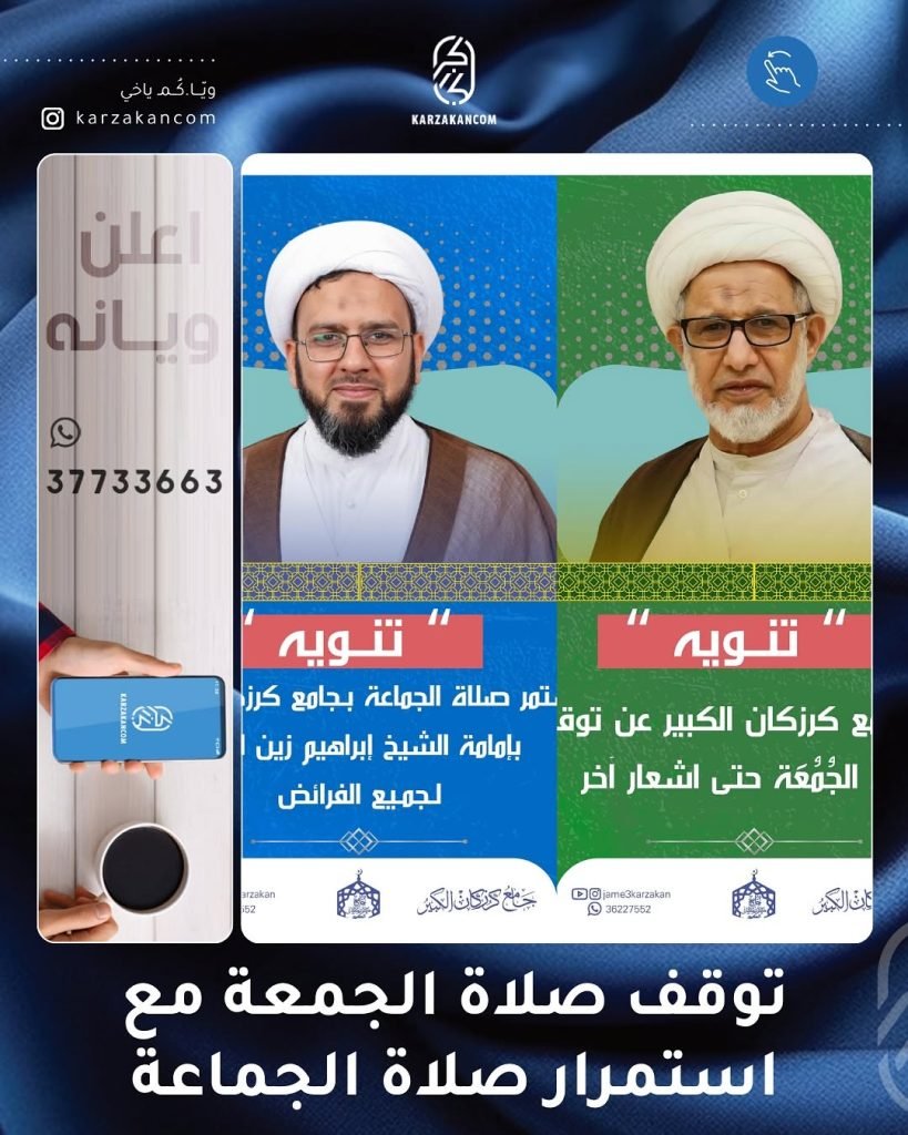 ۩ جۚامۘـ؏ كرزكان .. - يعلن جامع كرزكان الكبير عن توقف *صلاة الجُمعَة* حتى إشعار آخر . * كما يعلن عن إستمرار *صلاة الجماعة* لجميع الفرائض بإمامة الشيخ إبراهيم زين الدين @jame3karzakan المصدر: إنستغرام