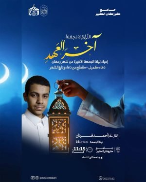 ها هي أيام شهر الرحمة توشك على الرحيل… والقلوب تتعلق بآخر أنفاسه الطاهرة، فلا تفوّت الفرصة 🌙 ✨ إحياء ليلة الجمعة الأخيرة من شهر رمضان ✨ اللهم لا تجعله آخر العهد🤲 📅 ليلة الجمعة 📍 الموافق: 19-30-2026 ⏰ الساعة: 11:15 مساءً 📍 المكان: جامع كرزكان الكبير 🔸 دعوة للحضور والمشاركة …