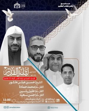 ╾ *▮⌊ ليلة القدر 21 فلكيا ⌉▮* ╼ ⌬ بمشاركة: 🎙️ *القارئ حسن سعيد * 🎙️ *الشيخ حسن عباس عاشور * 🎙️ *القارئ : محمد حمادة * 🎙️ *القارئ : خليل ياسين * ↓ 🗓️ *ليلة الثلاثاء 9 مارس 2026* ⌚ 11:00 مساءً 🕌 الرجال – جامع كرزكان الكبير 🕌 …