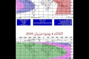 سيحدث الاقتران المركزي (المحاق المركزي) يوم الإثنين 03 يونيو/حزيران 2019 الساعة 10:02 بالتوقيت العالمي بمشيئة الله. إمكانية رؤية الهلال يوم الإثنين 03 يونيو/حزيران 2019 ويوم الثلاثاء 4 يونيو/حزيران 2019 موضحة في الأشكال التالية باستخدام برنامج المواقيت الدقيقة باعتماد معيار عودة، بحيث:- رؤية الهلال مستحيلة من المناطق الواقعة في اللون الأحمر بسبب غروب القمر قبل …