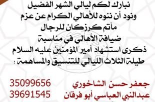 ‘ ۩ ﻣأﭠم ﻛرزﻛٱن .. . نبارك لكم ليالي الشهر الفضيل . و نود ان ننوه للأهالي الكرام عن عزم مأتم كرزكان للرجال ضيافة الأهالي في مناسبة ذكرى إستشهاد أمير المؤمنين عليه السلام طيلة الثلاث الليالي . للتنسيق و المساهمة : . جعفر حسن الشاخوري 35099656 عبدالنبي العباسي أبوفرقان 39691545 …