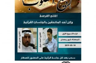 . برنامج الاسبوع الاول من ربيع القلوب . لجنة تعليم القران الكريم تعلن عن برنامج الجلسات القرانيه (ربيع القلوب) ضمن برنامجها لشهر رمضان المبارك (رمضان شهر القرآن). وتعلن عن وجود سحب على جوائز فورية على الحضور من الطلاب الصغار المصدر