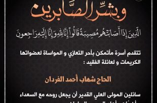 – . . بسم ٱلله الرَّحْمٰنِ الرَّحِيـمِ {كُلُّ نَفْسٍ ذَآئِقَةُ الْمَوْتِ وَإِنَّمَا تُوَفَّوْنَ أُجُورَكُمْ يَوْمَ الْقِيَامَةِ فَمَن زُحْزِحَ عَنِ النَّارِ وَأُدْخِلَ الْجَنَّةَ فَقَدْ فَازَ وَما الْحَيَاةُ الدُّنْيَا إِلاَّ مَتَاعُ الْغُرُورِ } صدق الله العلي العظيم يتقدم مأتم كرزكان للرجال بخالص العزاء والمواساة لعائلة المتوفاة . . “الحاج علي المرخوص” . . سائلين المولى …