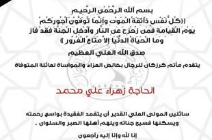 – . . . بسم ٱلله الرَّحْمٰنِ الرَّحِيـمِ {كُلُّ نَفْسٍ ذَآئِقَةُ الْمَوْتِ وَإِنَّمَا تُوَفَّوْنَ أُجُورَكُمْ يَوْمَ الْقِيَامَةِ فَمَن زُحْزِحَ عَنِ النَّارِ وَأُدْخِلَ الْجَنَّةَ فَقَدْ فَازَ وَما الْحَيَاةُ الدُّنْيَا إِلاَّ مَتَاعُ الْغُرُورِ } صدق الله العلي العظيم . . يتقدم مأتم كرزكان للرجال بخالص العزاء والمواساة لعائلة المتوفاة . . “الحاجة زهراء علي محمد” …
