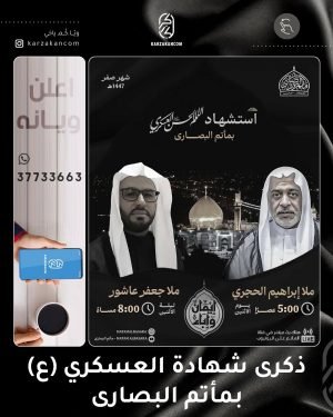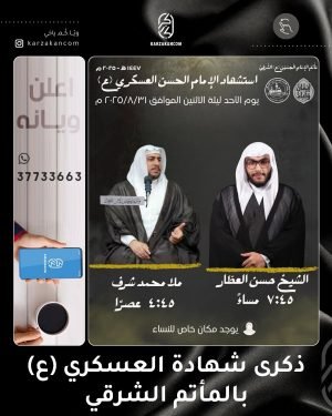 ❞ ذكـــــــــــرىٰ اســــتشـھــاد ،، ❞ الإمام الحسن العسكري ’ع‘ ،، ▓ ليلة الإثنين 31-8-2025 ▓ موكب أبناء الطف (للأشبال) █ الرادود الحسيني حسين عاشور ≣ الإنطلاق من أمام مأتم كرزكان للرجال ⌯ 08:10 مساءً ▓ الخطابة الحسينية █ الشيخ بشار العالي ≣ مأتم كرزكان للرجال ⌯ 08:50 مساءً ▓ موكب …