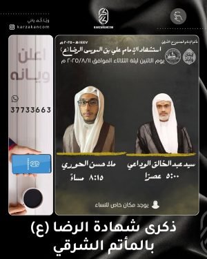 ❞ ذكــــــــــــــرىٰ اســـــتشـھــــــاد ،، ❞ الإمام علي بن موسىٰ الرضا ’ع‘ ،، ▓ ليلة الثلاثاء 11-8-2025 ▓ الخطابة الحسينية █ سماحة الشيخ بشار العالي ≣ مأتم كرزكان للرجال ⌯ 09:10 مساءً ▓ موكب العزاء █ الرادود الحسيني أحمد الماجد ≣ الإنطلاق من أمام مأتم كرزكان للرجال ⌯ 10:15 مساءً ┈╾⊶﹝₍⁽( …