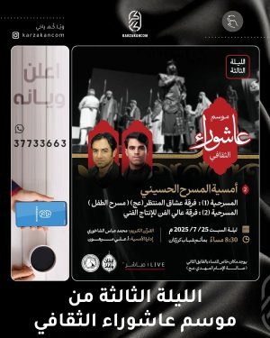 *`•۞( موسم ﻋَــاشُـــﯚرَاءْ الثقافي )۞•`* ≣ الليلة الثالثة ⓷ *أُمسية المسرح الحسيني* ≣ المسرحية 1 ⎙ فرقة عشاق المنتظر “عج” (مسرح الطفل) ≣ المسرحية 2 ⎙ فرقة عالي الفن للإنتاج الفني ⌯ القرآن الكريم: محمد عباس الشاخوري ⌯ إدارة الأُمسية: أ. علي مرهون █ ليلة السبت 2025/7/25 ≣ مأتم شباب …