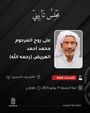 أكمل القراءة »مجلس تأبيني للنساء لروح المرحوم الحاج محمد أحمد العريض رحمه الله ليلة غد ليلة الجمعة الموافق ١٧ يوليو ٢٠٢٥ في مأتم بيت الحسين ع الساعة الثامنة تماماً.
