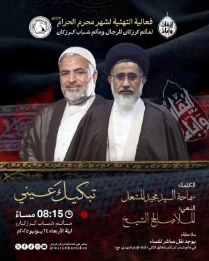 فعالية التهيئة لشـــهـر محرم الحرام 1447هـ ▪️بمشاركة: -السيد مجيد المشعل. -الملا صـالح الــشيــخ. ▪️ليلة الأربعاء الموافق 24-6-2025 ⏰ 08:15 مساءً ملاحظة: يوجد نقل مباشر للنساء بالطابق الثاني (قاعة الإمام المهدي) المصدر: إنستغرام