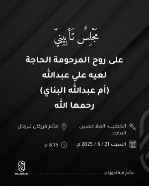 ◼️على روح المرحومة الحاجة لعيه علي عبدالله (أم عبدالله البناي) الخطيب: الملا حسين الماجد. * مأتم كرزكان للرجال. الفاتحة المصدر: إنستغرام