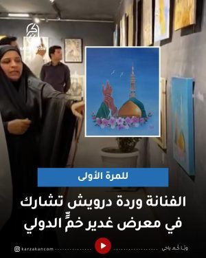 وتعد مشاركة درويش هي الأولى من نوعها في هذا المعرض الدولي، إذ شاركت بلوحة تعبيرية بدت فيها يدان ترمزان إلى رفع النبي {صلى الله عليه وآله وسلم} ليد الإمام علي {عليه السلام} في حادثة الغدير، وامتزجت فيها القبة الخضراء للحرم النبوي مع قبة الإمام علي {عليه السلام}، وما حوته الورود …