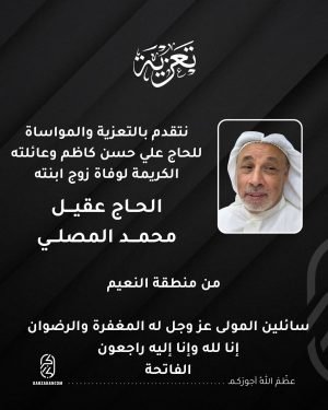 بوفاة زوج ابنته *الحاج عقيل محمد المصلي* من منطقة النعيم أمس الجمعة 20-6-2025 تفاصيل أوقات ومجالس التعزية في الصورة المرفقة *أماكن مجالس التعزية*: *للرجال*: مأتم النعيم الغربي *للنساء*: صالة السيد حسين الغريفي (المشروع) ختام الفاتحة يوم الاثنين 23-6-2025 تغمد الله الفقيد بواسع رحمته وألهم أهله وذويه الصبر والسلوان رحم الله …