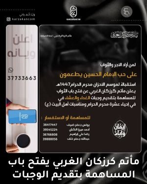 على حب الإمام الحسين يطعمون استقبالاً لموسم الأحزان، محرم الحرام 1447هـ يعلن مأتم كرزكان الغربي عن فتح باب الثواب للمساهمة بتقديم وجبات الغداء و العشاء في إحياء عشرة محرم الحرام و مناسبات أهل البيت (ع) للمساهمة أو الاستفسار : يونس جعفر ضيف 36417447 أحمد ميرزا الكش 39545224 رضا علي إبراهيم …