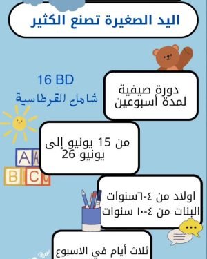🎨🧁✨ اليد الصغيرة تصنع الكثير ✨🧁🎨 دورة صيفية ممتعة للأطفال لمدة أسبوعين 🌞💫 هل طفلك يحب التلوين؟ يحب يخبّص بالألوان؟ يجرب يطبخ؟ يسوي أعمال يدوية؟ يلعب ويتعلم بنفس الوقت؟ خلّيه ينضم لدورتنا المميزة والمليانة أنشطة منوّعة! 👩🎨👨🍳 📌 تشمل أنشطتنا: 🎨 الرسم والتلوين 🖐️ أشغال يدوية ممتعة 🍪 وصفات طبخ …