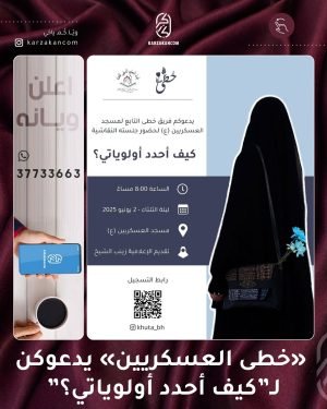 يعلن *فريق خطى* التابع لمسجد العسكريين فعاليته الحادية عشرة .. (*كيف أحدد أولوياتي*) 🪻*اليوم:* يوم الإثنين ، ليلة الثلاثاء 🪻*التاريخ:* 2-6-2025 🪻*الوقت:* 8:00 مساءً 🪻*الفئة:* 15 فما فوق 🪻*المكان:* مسجد العسكريين (ع) 🪻*تقديم:* أ. زينب الشيخ ♦️يمكن لذوي الأعذار الدخول 🪻*للاستفسار:* 33790744 للتسجيل :عبر الرابط https://forms.gle/2SpLAmAaziSBizy1A 📌 تابعونا عبر: @khuta_bh …