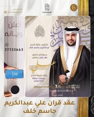 أكمل القراءة »🌺يتشرف الحاج عبدالكريم جاسم خلف بدعوتكم لحفل عقد قران نجله *«علي»*، بمأتم شباب كرزكان.